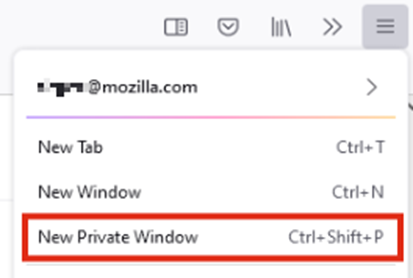 To open a Private Browser Window in Firefox, click on the Firefox Menu in the upper-right-hand corner of the browser and select New Private Window. You can also use the shortcut Shift + ⌘ + P (on macOS) or Shift + CTRL + P (on Windows).